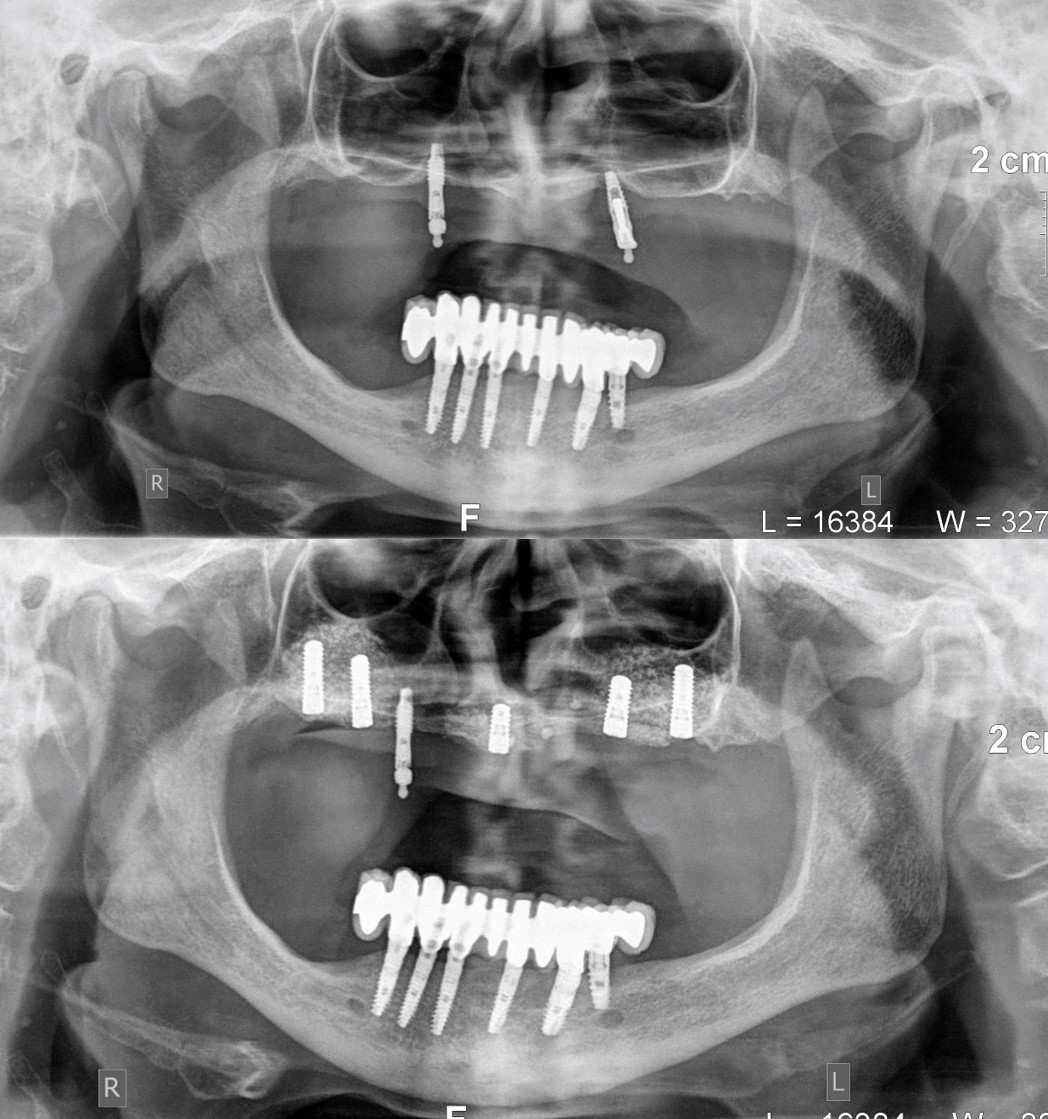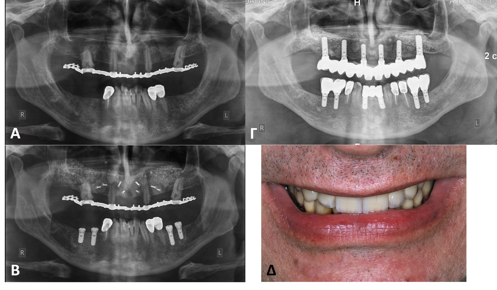 Προηγείται η αναπλαστική επέμβαση (οστική αυτομεταμόσχευση) που συνήθως γίνεται σε νοσοκομειακό περιβάλλον και μετά την παρέλευση 5 ως 6 μηνών, χρονικού διαστήματος που απαιτείται για την ωρίμανση και τη βιολογική ενσωμάτωση του οστικού μοσχεύματος, ακολουθεί στο ιατρείο η τοποθέτηση των οδοντικών εμφυτευμάτων στις ιδανικές θέσεις και με απόλυτα προβλέψιμο τρόπο.